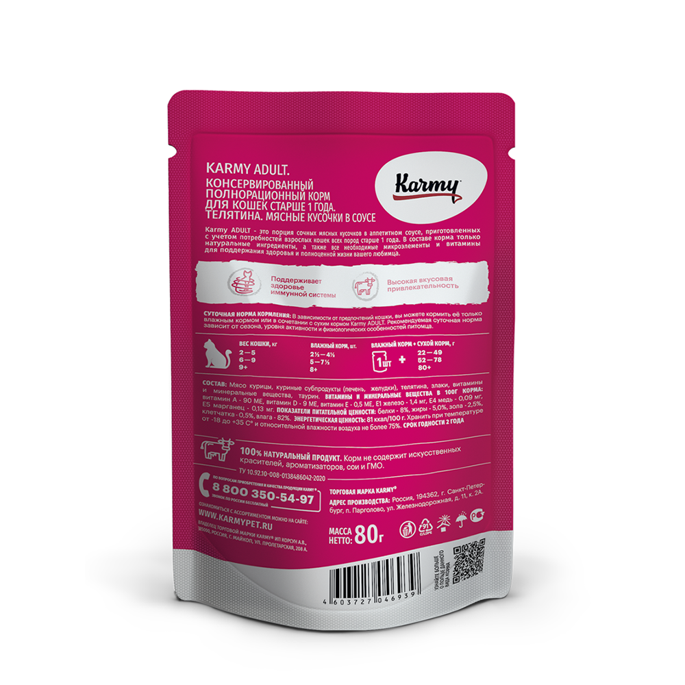 Karmy Adult — это порция сочных мясных кусочков в ароматном соусе, приготовленных с учетом индивидуальных потребностей взрослых кошек всех пород старше 1 года. В составе корма — только натуральные ингредиенты, а также все необходимые микроэлементы и витамины для поддержания здоровья и полноценной жизни вашего любимца.