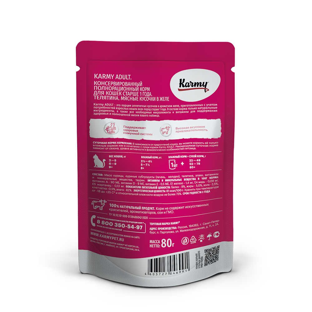Karmy Adult — это порция аппетитных кусочков в ароматном желе, приготовленных с учетом индивидуальных потребностей взрослых кошек всех пород старше 1 года. В составе корма — только натуральные ингредиенты, а также все необходимые микроэлементы и витамины для поддержания здоровья и полноценной жизни вашего любимца.