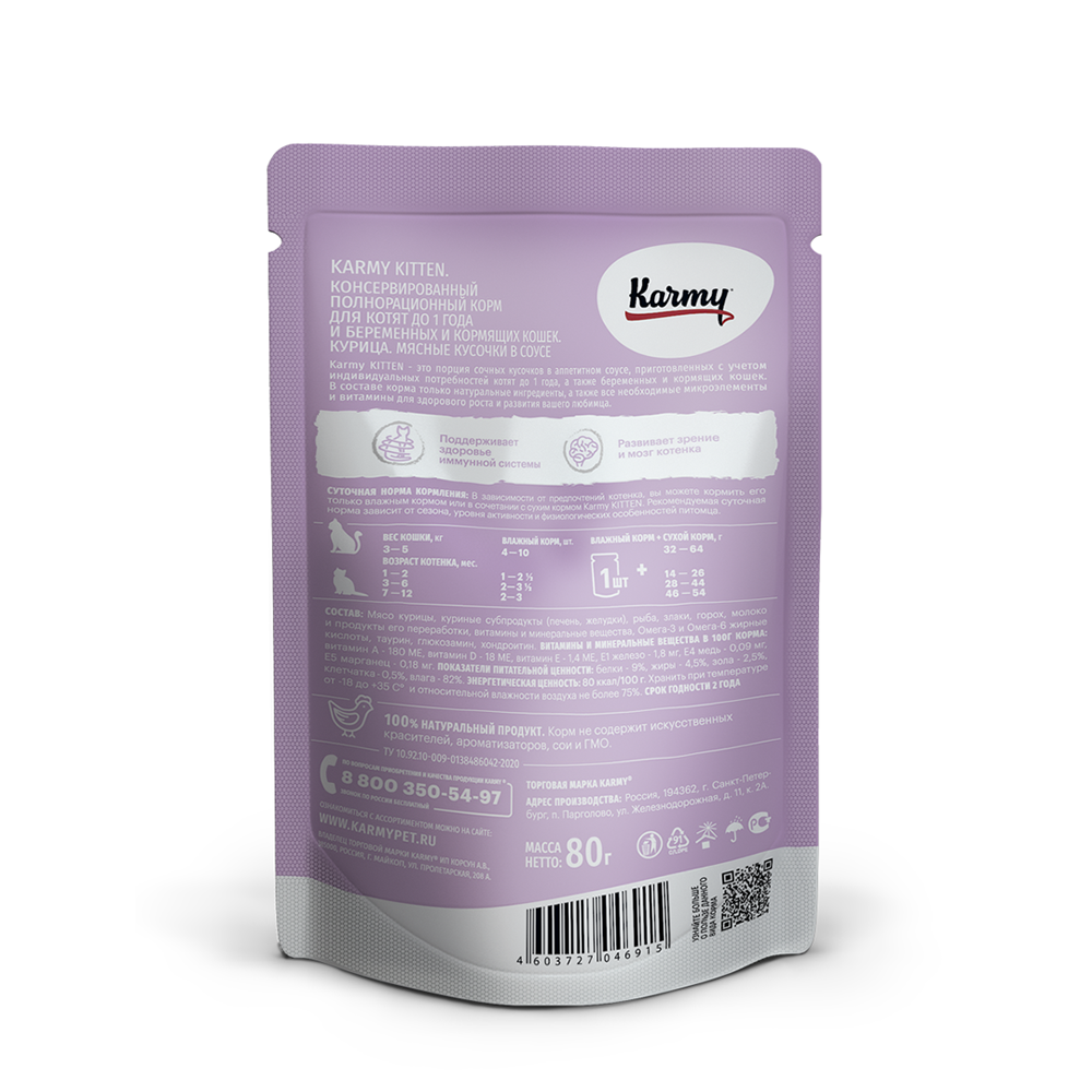 Karmy Kitten — это порция сочных кусочков в ароматном соусе, приготовленных с учетом индивидуальных потребностей котят до 1 года, а также беременных и кормящих кошек. В составе корма — только натуральные ингредиенты, а также все необходимые микроэлементы и витамины для здорового роста и развития вашего любимца.