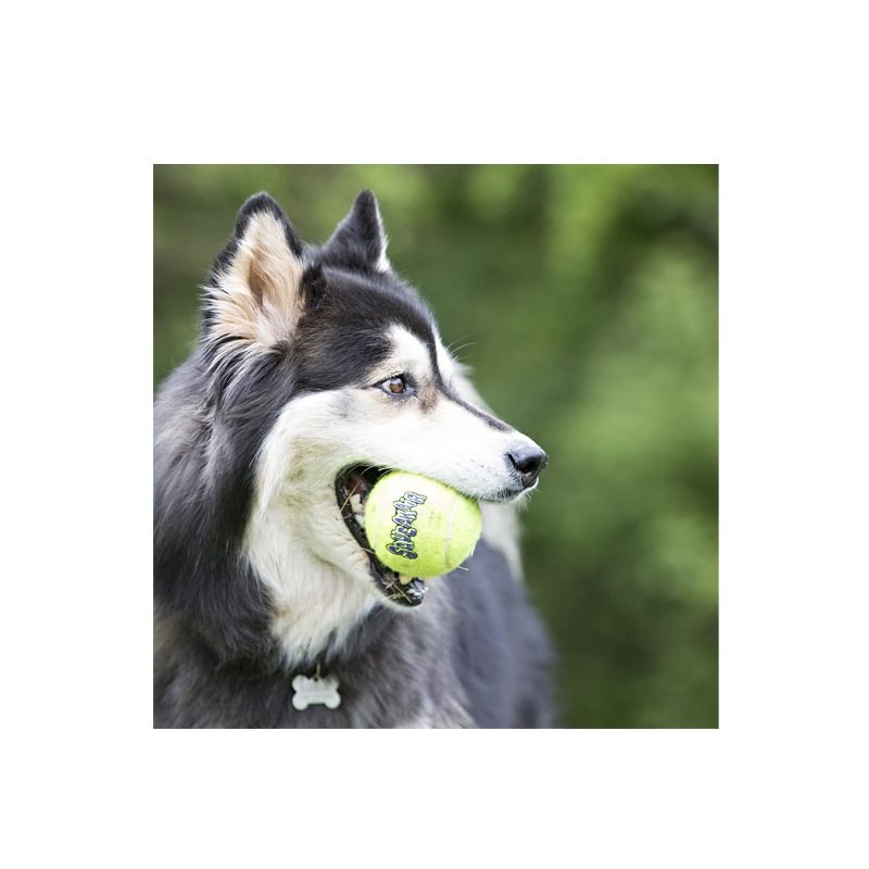 Идеально подходит для игр с апортом, так как совмещает в себе две классических и любимых собаками игрушки: теннисный мяч и пищалку. Неабразивный высококачественный материал не причинит вреда зубам собаки.