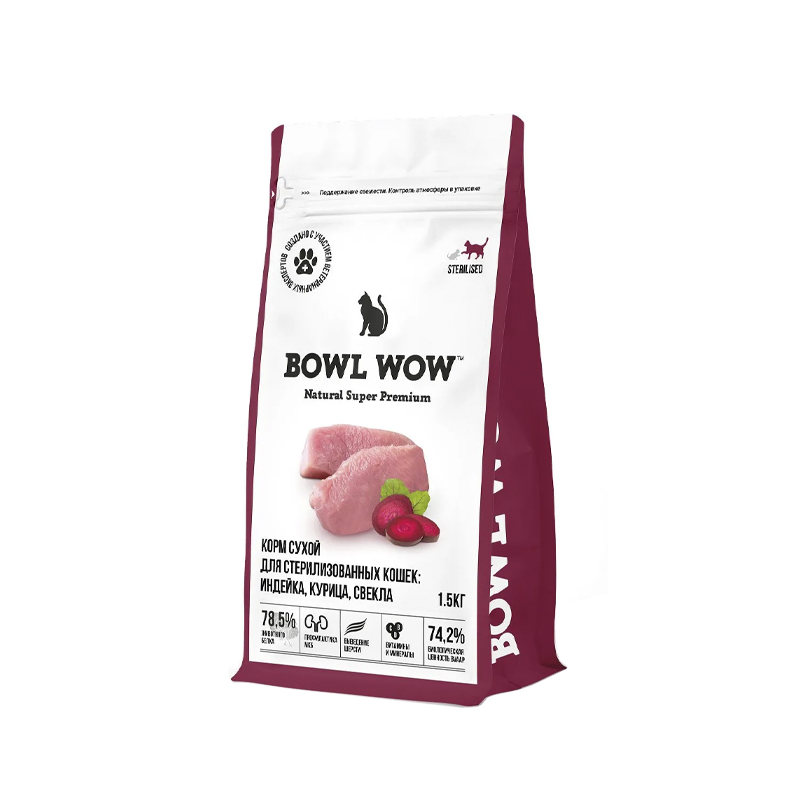 Полнорационный корм BOWL WOW с индейкой, курицей и свеклой предназначен для кошек, здоровье которых требует особенно внимательного отношения. Один из приоритетов при выборе рациона для стерилизованных животных — контроль веса, поскольку они менее активны, чем нестерилизованные питомцы. Совместно с ветеринарными диетологами мы создали корм для формирования правильного энергетического профиля рациона — с пониженным уровнем жиров и повышенным содержанием натуральной клетчатки для более быстрого насыщения.