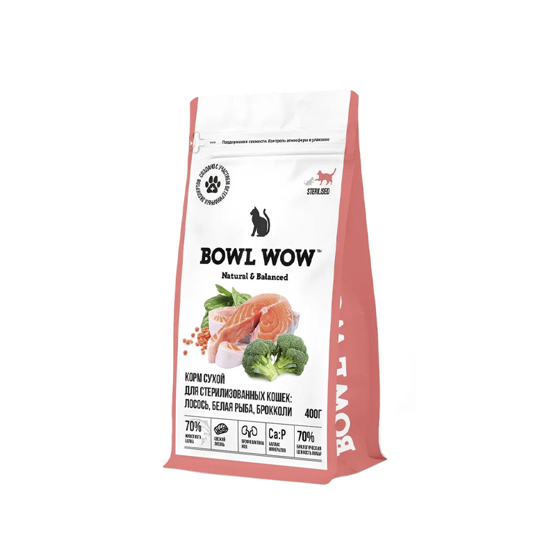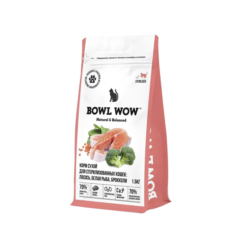Полнорационный корм BOWL WOW с лососем, белой рыбой океанических пород и брокколи — это формула со свежим сочным лососем и правильным энергетическим профилем. Она позволяет не только контролировать вес стерилизованного питомца, но и способствует профилактике МКБ благодаря правильному соотношению кальция, фосфора, магния и добавлению клюквы для здоровья мочевыделительной системы. Размер гранул 8 мм идеально подходит для взрослых кошек.