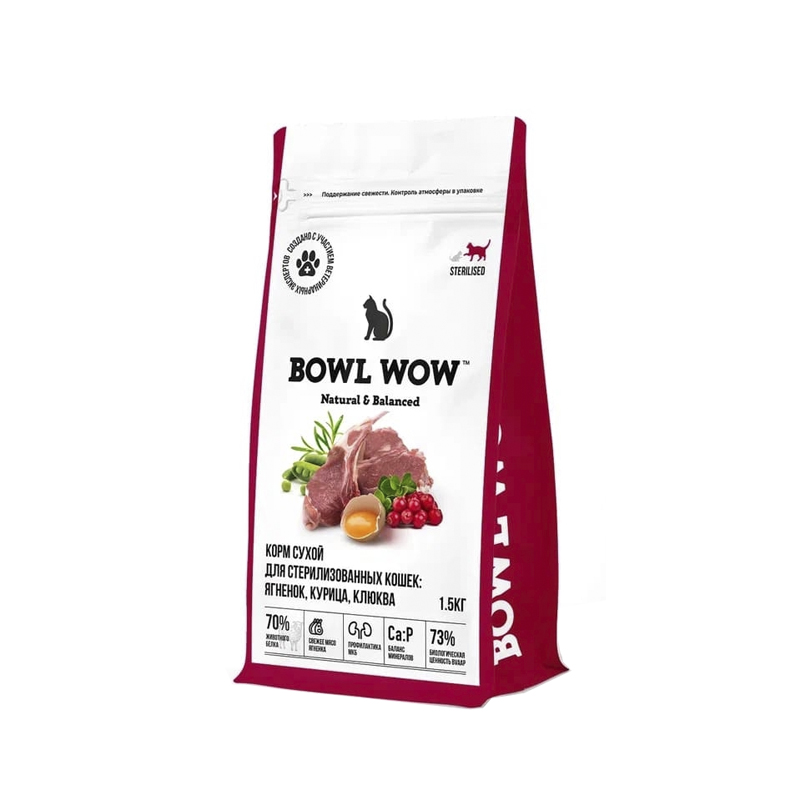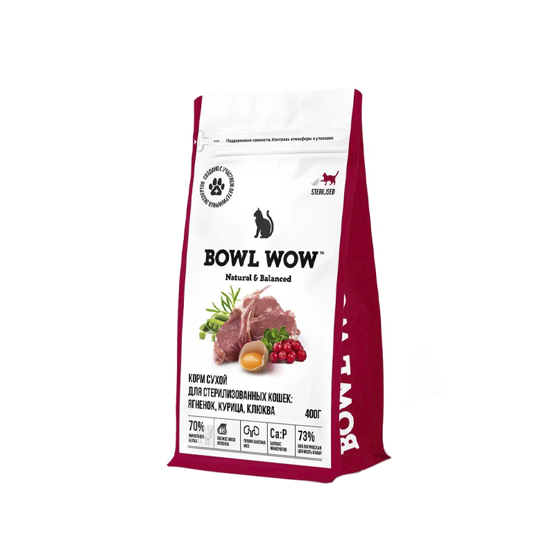 Полнорационный корм BOWL WOW с ягненком, курицей и клюквой — это формула со свежим бескостным мясом, полезными субпродуктами и правильным энергетическим профилем. Она позволяет не только контролировать вес стерилизованного питомца, но и способствует профилактике МКБ благодаря правильному соотношению кальция, фосфора, магния и добавлению клюквы для здоровья мочевыделительной системы. Размер гранул 8 мм идеально подходит для взрослых кошек.