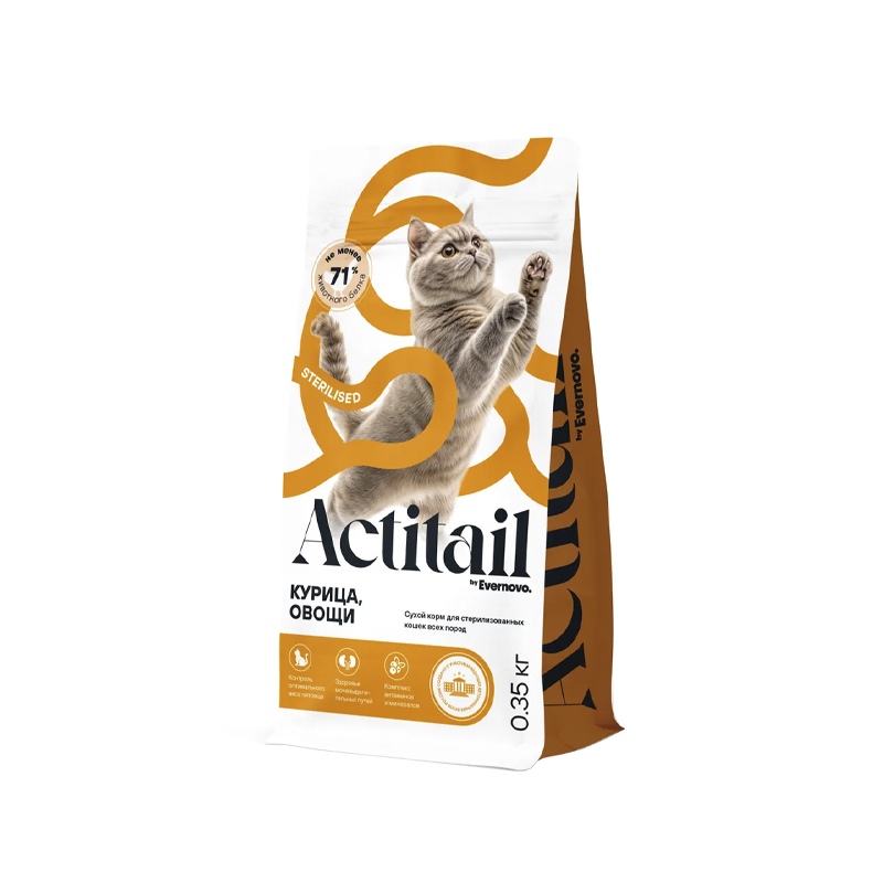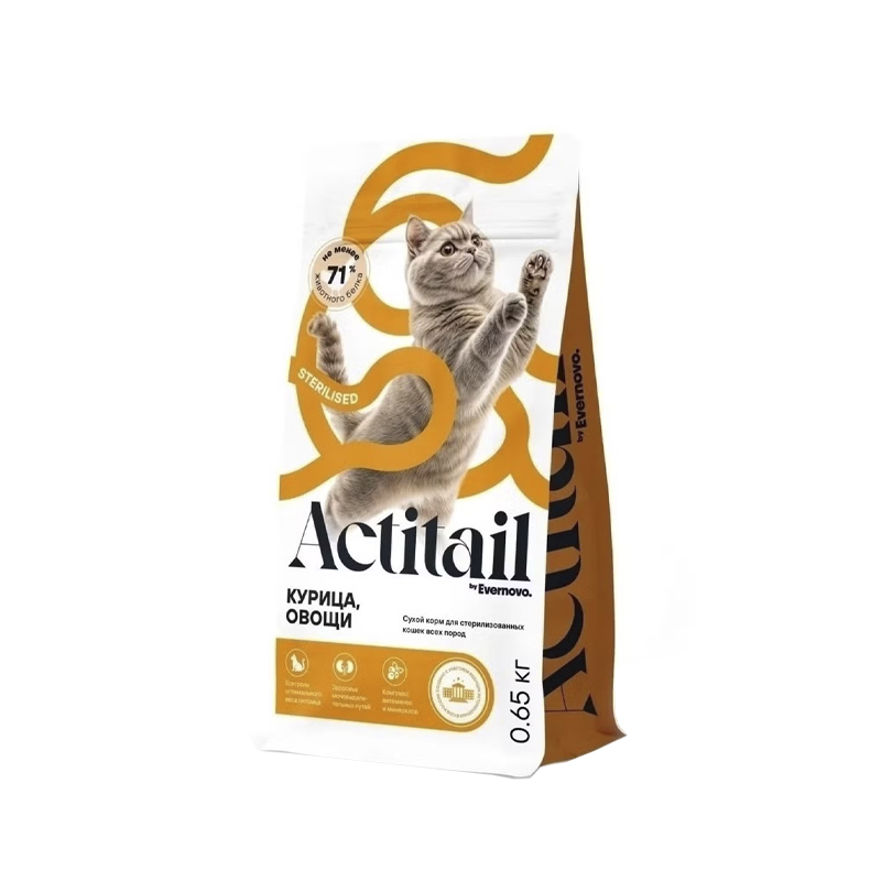 Корм сухой полнорационный Actitail с курицей и добавлением овощей — идеальное питание для стерилизованных кошек! Рацион с высоким содержанием животного белка (71%), включающий 43% курицы, разработан ветеринарными диетологами, чтобы обеспечить полноценное питание домашних питомцев. Корм с оптимальным количеством белков и низким количеством жира поддерживает здоровый вес животного. Полнорационный продукт для кормления кошки после стерилизации содержит пониженное содержание кальция, фосфора и магния для профилактики мочекаменной болезни и L-карнитин для контроля веса животного. Корм содержит уникальный комплекс Eo Sterilised с клюквой, брусникой и растительной клетчаткой для поддержания здоровья мочевыводящих путей и комфортного пищеварения. В состав входят куриный жир, комплекс витаминов и минералов.