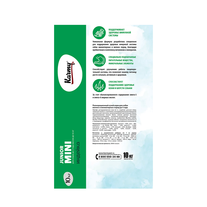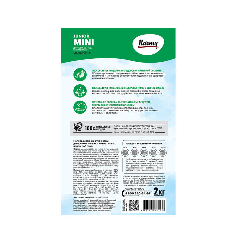 Состав: Дегидрированное мясо (в т.ч. индейка), цельные злаки, животный жир (в т.ч. лососевый, консервированный витамином E), растительная клетчатка, высокоусвояемый растительный белок, гидролизованные мясные белки, пивные дрожжи (источник маннанолигосахаридов), витаминно-минеральный комплекс, Юкка Шидигера, морская капуста, пробиотики (Bacillus subtilis, Bacillus licheniformis), сушеное яблоко. Cохранено витамином С и природным токоферолом (источник натурального витамина Е).