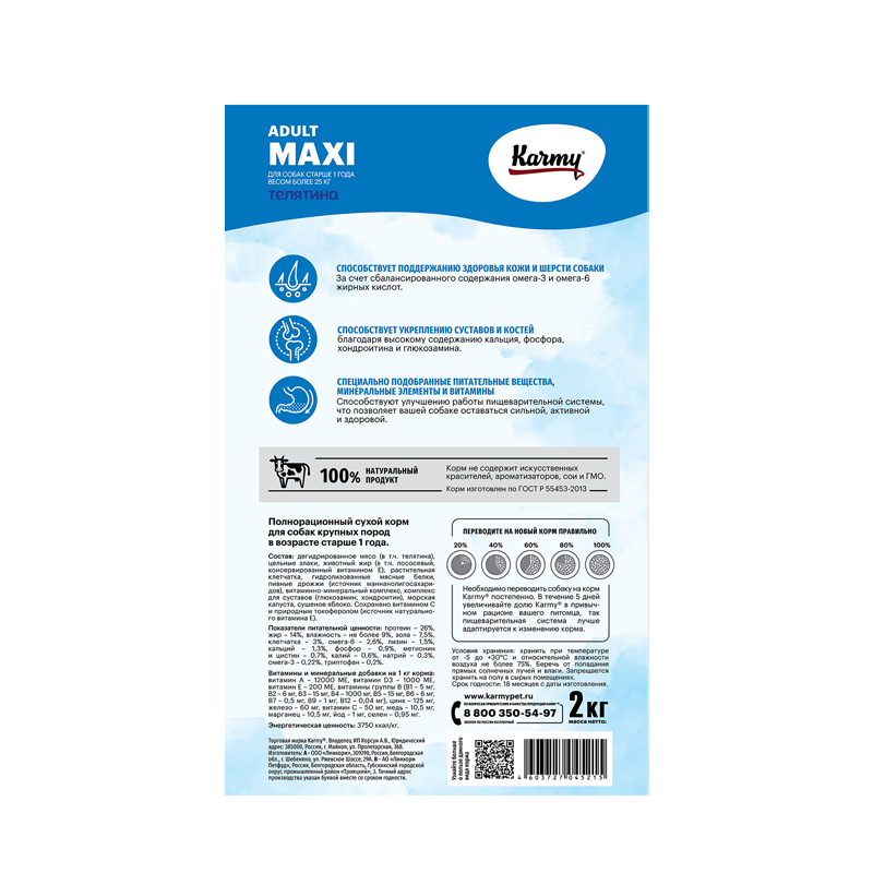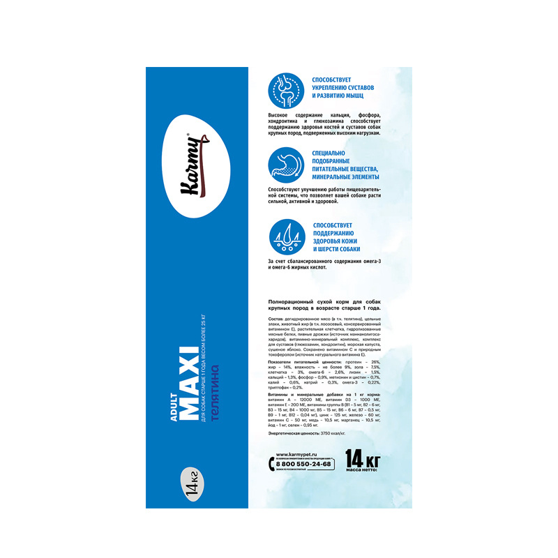 Состав: Дегидрированное мясо (в т.ч. телятина), цельные злаки, животный жир (в т.ч. лососевый, консервированный витамином E), растительная клетчатка, гидролизованные мясные белки, пивные дрожжи (источник маннанолигосахаридов), витаминно-минеральный комплекс, комплекс для суставов (глюкозамин, хондроитин), морская капуста, сушеное яблоко. Cохранено витамином С и природным токоферолом (источник натурального витамина Е).