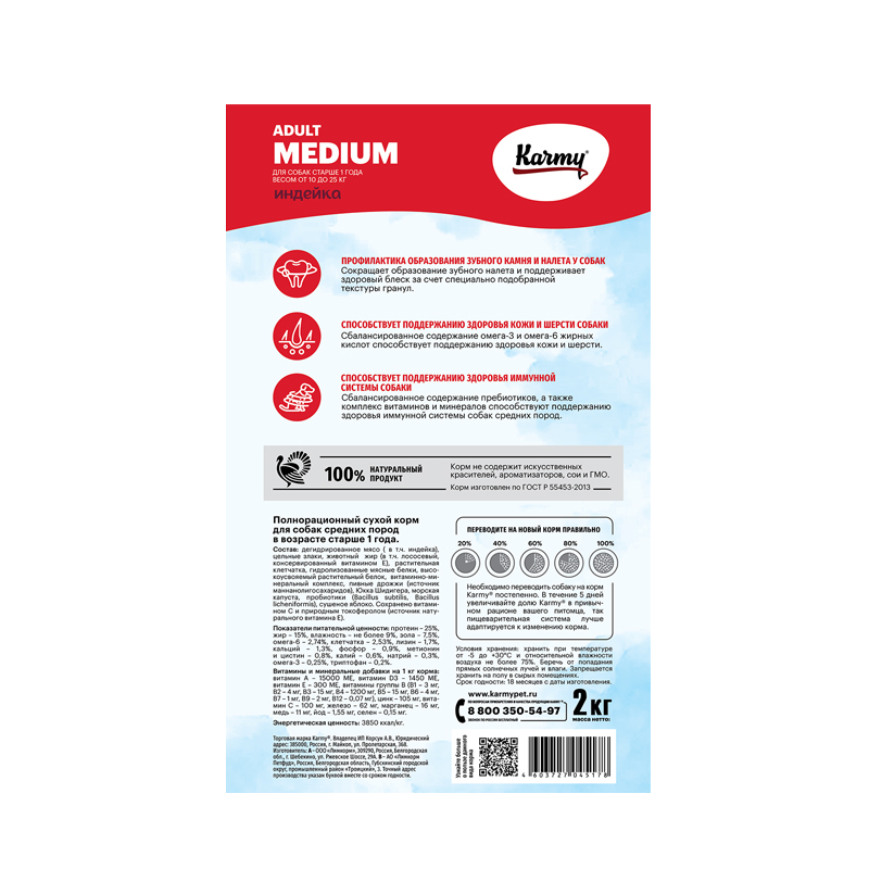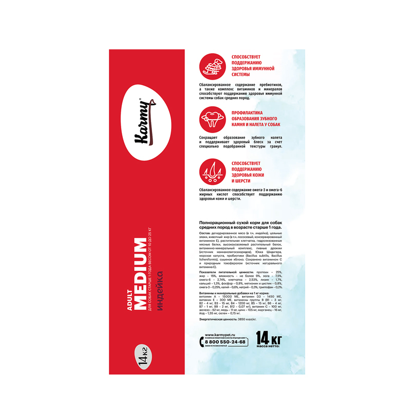 Состав: Дегидрированное мясо (в т.ч. индейка), цельные злаки, животный жир (в т.ч. лососевый, консервированный витамином E), растительная клетчатка, гидролизованные мясные белки, высокоусвояемый растительный белок, витаминно-минеральный комплекс, пивные дрожжи (источник маннанолигосахаридов), Юкка Шидигера, морская капуста, пробиотики (Bacillus subtilis, Bacillus licheniformis), сушеное яблоко. Cохранено витамином С и природным токоферолом (источник натурального витамина Е).3850 ккал/кг
