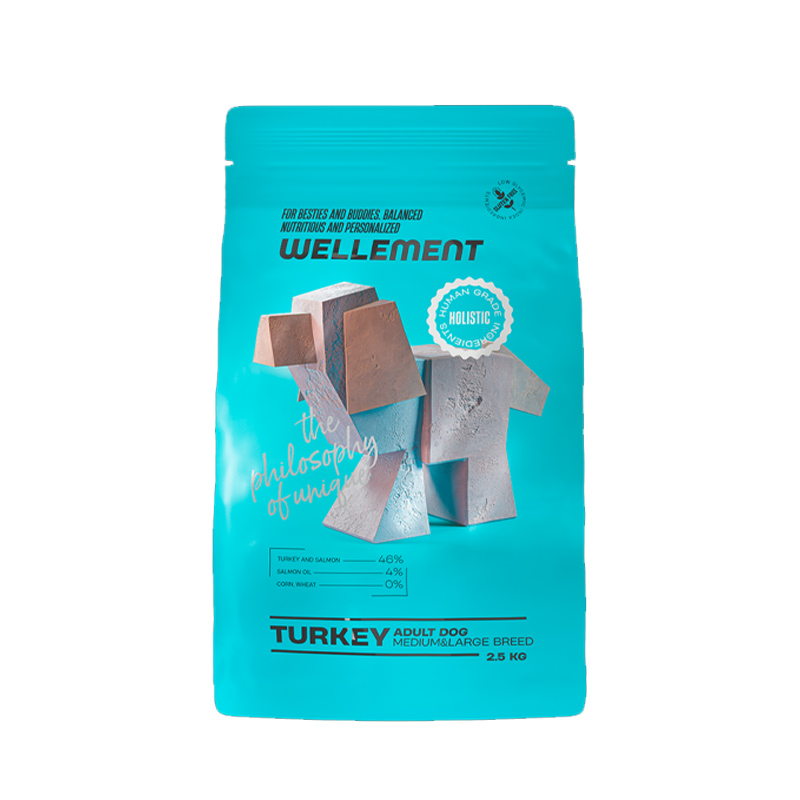 Чтобы сделать гастрономическую жизнь собаки более насыщенной, Wellement предлагает ряд разнообразных продуктов, благодаря чему вы легко можете разнообразить рацион питомца. За основу рациона можно взять сухой корм для взрослых собак средних и крупных пород с индейкой и кроликом. Свежее мясо индейки, батат, нут, горох и масло лосося обеспечат вашей собаке чувство длительного удовлетворения и помогут поддержать любые начинания собаки, будь то игры или просто сон.