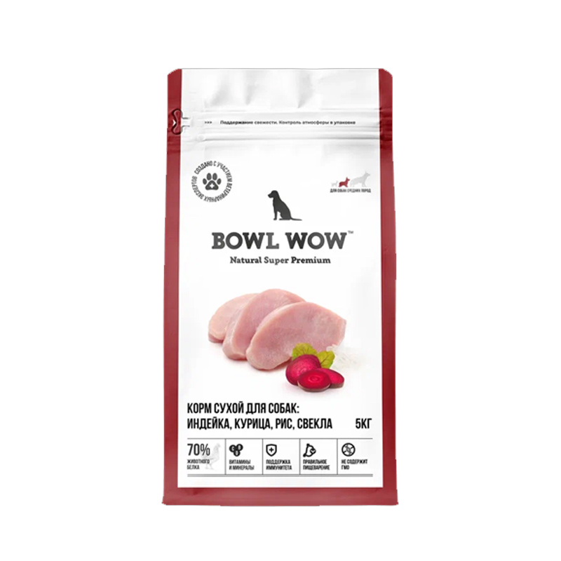 Полнорационный корм BOWL WOW с индейкой, курицей, рисом и свеклой разработан специально для собак средних пород (весом от 10 до 25 кг). В его состав, помимо полного набора белков, жиров, углеводов, витаминов и микроэлементов, введены компоненты для поддержки иммунитета, суставов и заботы о правильном пищеварении вашего питомца. Размер гранул 12–14 мм специально разработан для взрослых собак средних пород.