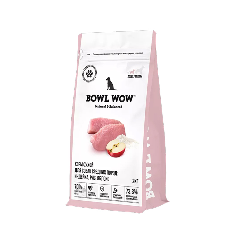 Полнорационный корм BOWL WOW с индейкой, рисом и яблоком разработан специально для собак средних пород (весом от 10 до 25 кг). В его состав, помимо полного набора белков, жиров, углеводов, витаминов и микроэлементов, введены компоненты для поддержки иммунитета, суставов и заботы о правильном пищеварении вашего питомца. Размер гранул 12–14 мм специально разработан для взрослых собак средних пород.