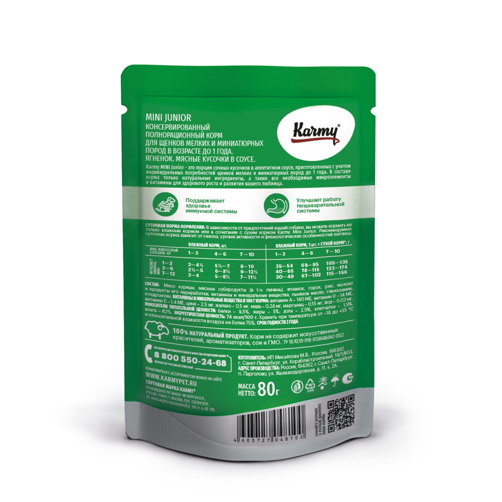 Karmy Mini Junior — это порция сочных кусочков в аппетитном соусе, приготовленных с учетом индивидуальных потребностей щенков мелких и миниатюрных пород до 1 года. В составе корма — только натуральные ингредиенты, а также все необходимые микроэлементы и витамины для здорового роста и развития вашего любимца.