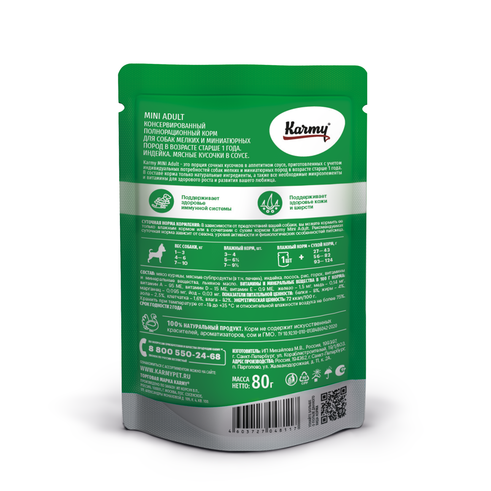 Karmy Mini Adult — это порция сочных кусочков в аппетитном соусе, приготовленных с учетом индивидуальных потребностей собак мелких и миниатюрных пород в возрасте старше 1 года. В составе корма — только натуральные ингредиенты, а также все необходимые микроэлементы и витамины для здорового роста и развития вашего любимца.