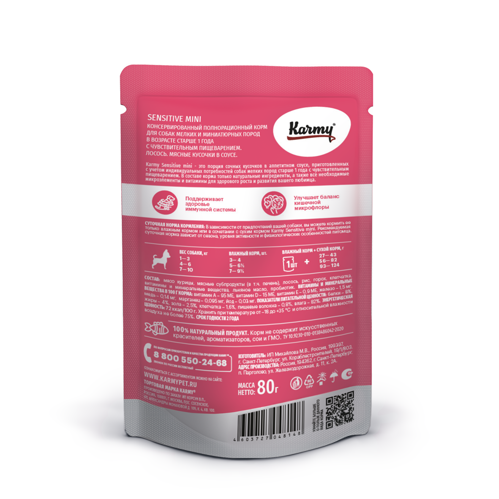 Karmy Sensitive Mini — это порция сочных кусочков в аппетитном соусе, приготовленных с учетом индивидуальных потребностей собак мелких пород старше 1 года с чувствительным пищеварением. В составе корма — только натуральные ингредиенты, а также все необходимые микроэлементы и витамины для здорового роста и развития вашего любимца.